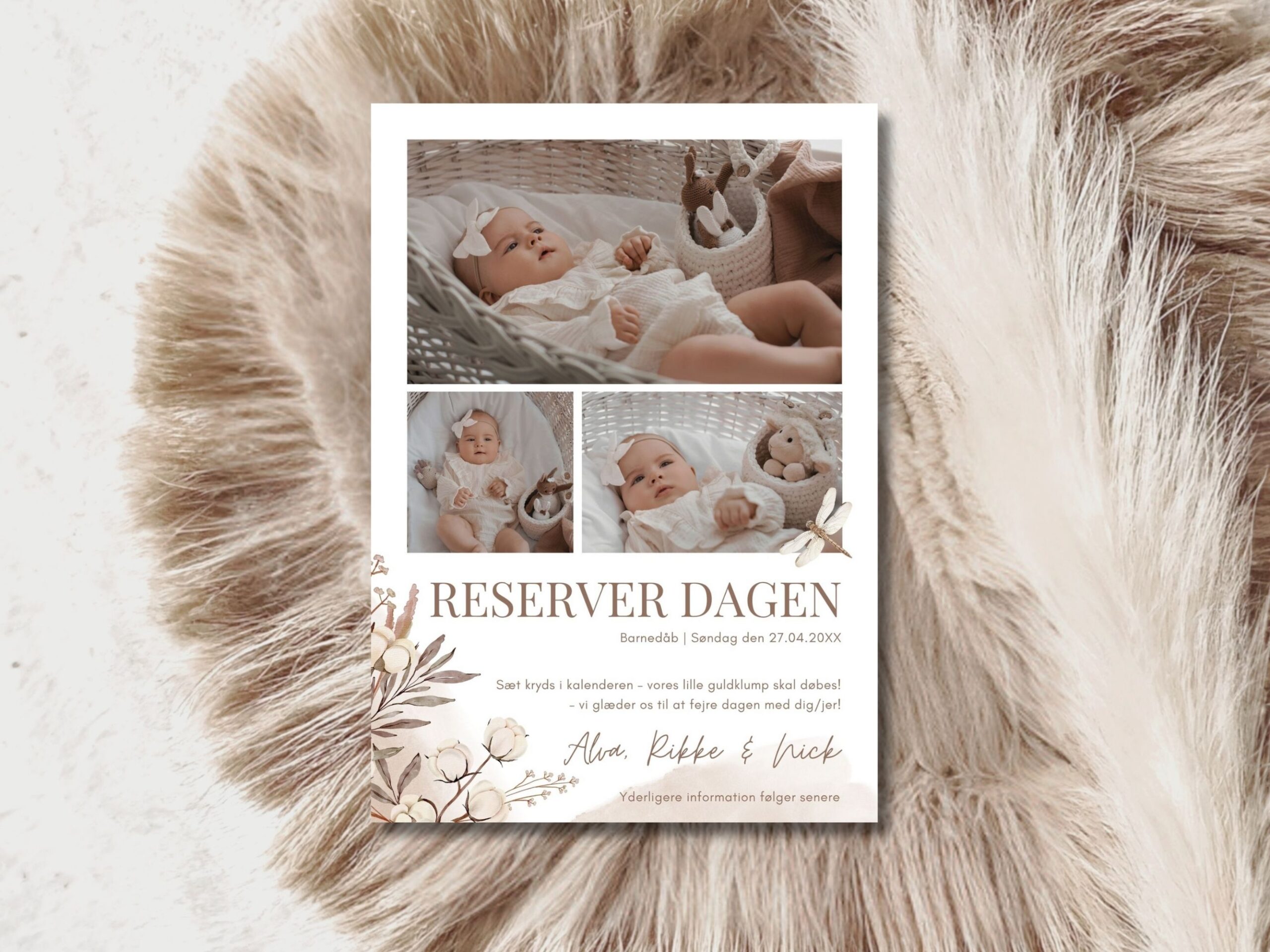 Vores skabeloner giver jer friheden til at skabe et unikt save the date kort, der giver jeres gæster mulighed for at være en del af denne vigtige milepæl. Perfekt til at sætte tonen for barnedåbsfesten allerede fra starten.