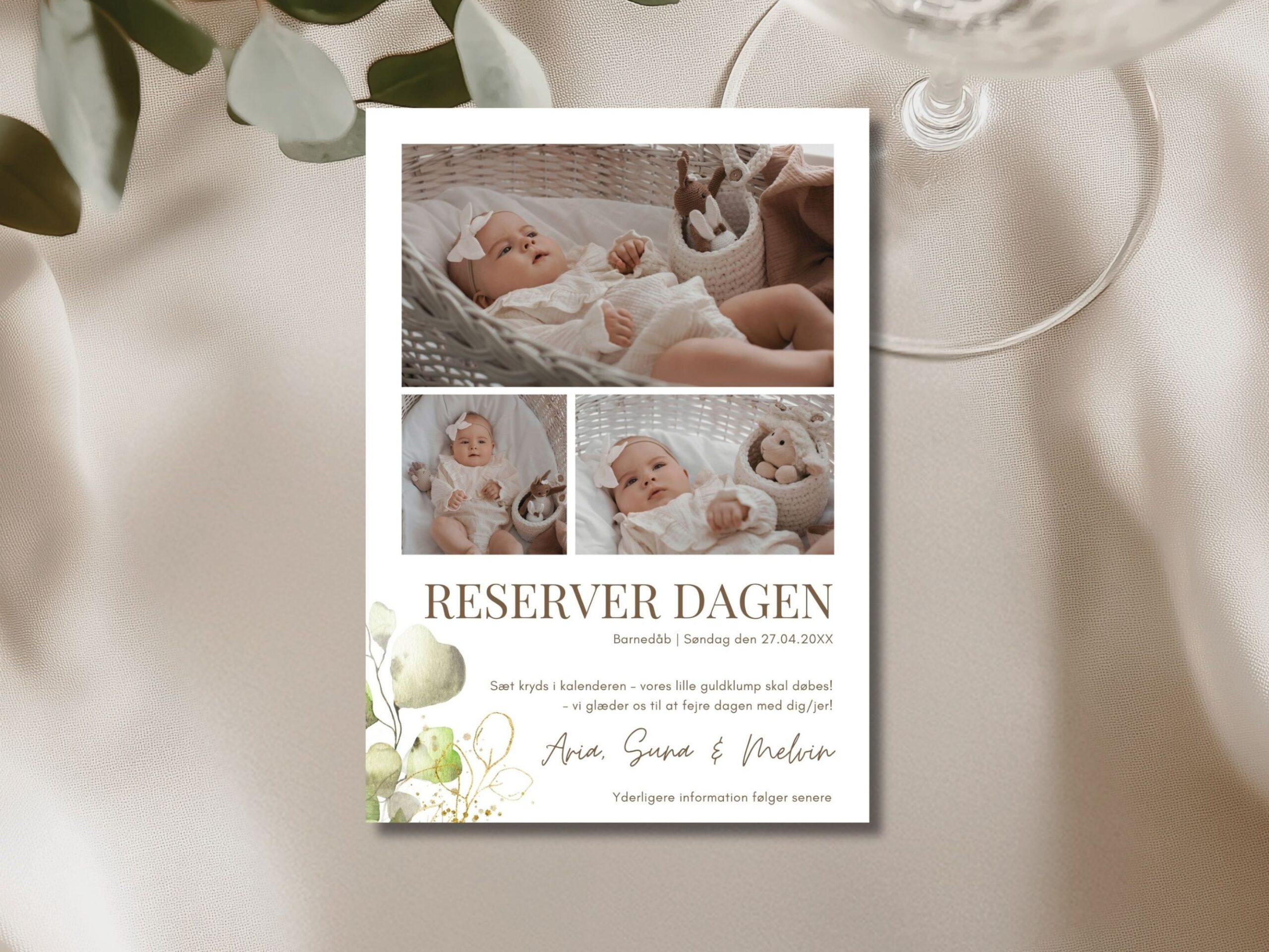 Vores skabeloner giver jer friheden til at skabe et unikt save the date kort, der giver jeres gæster mulighed for at være en del af denne vigtige milepæl. Perfekt til at sætte tonen for barnedåbsfesten allerede fra starten.