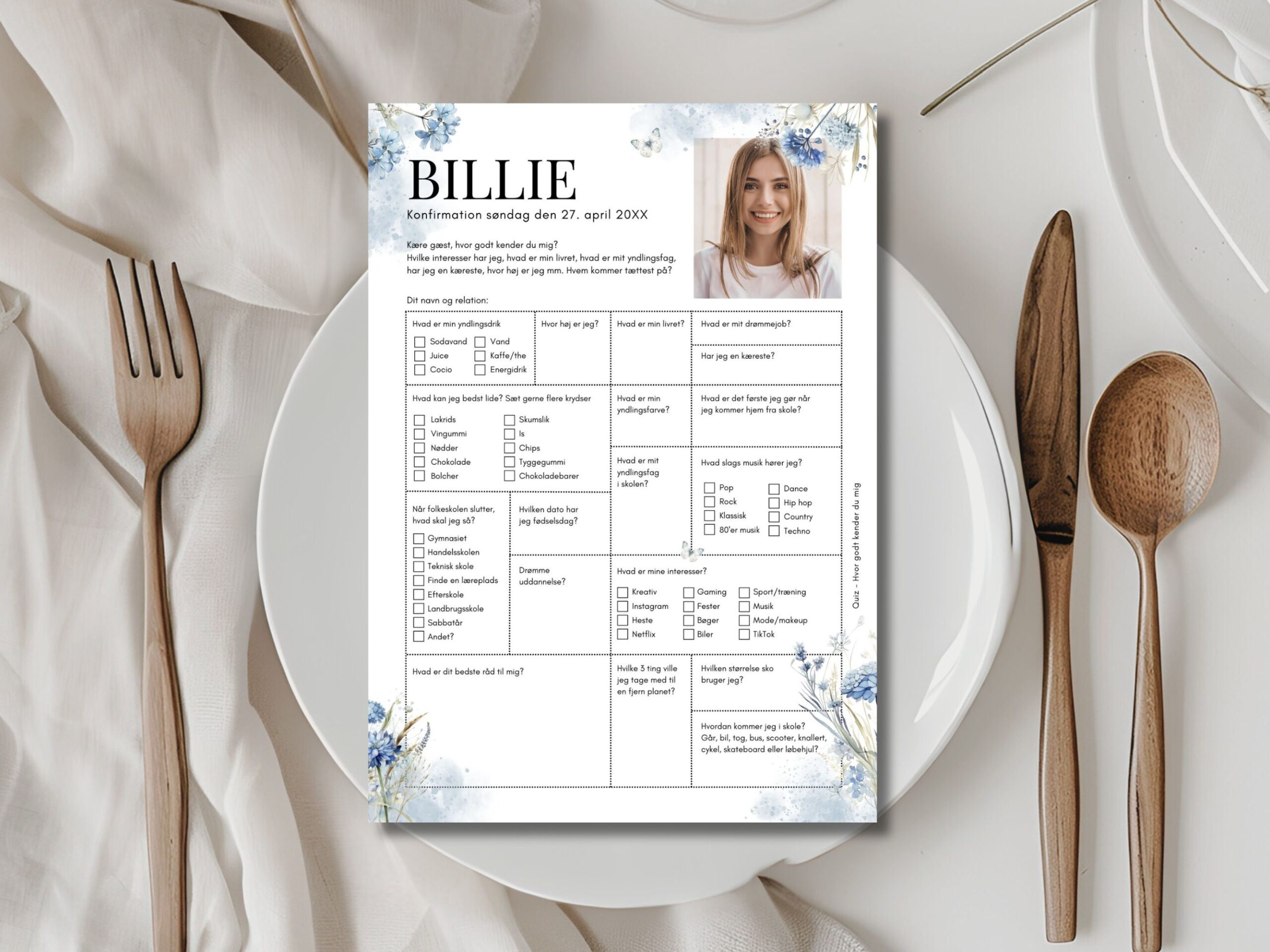 Du kan ændre tekst, farver og andre elementer, så quizzen passer perfekt til netop din fest. Tilføj konfirmandens navn, dato for festen, billede og andre personlige detaljer for at gøre oplevelsen helt unik. Når du er færdig med at tilpasse, kan du nemt gemme og downloade den færdige fil.