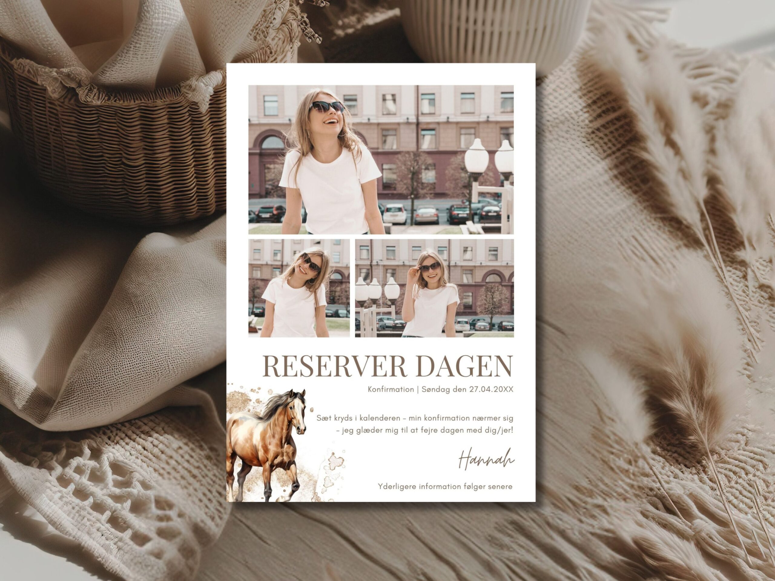 Vil I sikre jer, at gæsterne reserverer datoen til konfirmationen? Med vores redigerbare save the date kort til konfirmation kan I nemt skabe et personligt kort, der afspejler den store dag. Vælg mellem stilfulde og moderne designs, som I kan tilpasse med jeres egen tekst, billeder og farver.