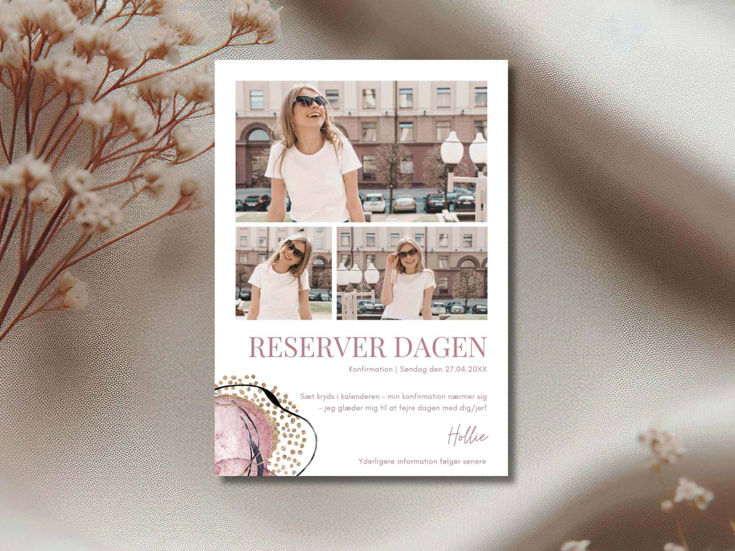 Vil I sikre jer, at gæsterne reserverer datoen til konfirmationen? Med vores redigerbare save the date kort til konfirmation kan I nemt skabe et personligt kort, der afspejler den store dag. Vælg mellem stilfulde og moderne designs, som I kan tilpasse med jeres egen tekst, billeder og farver.