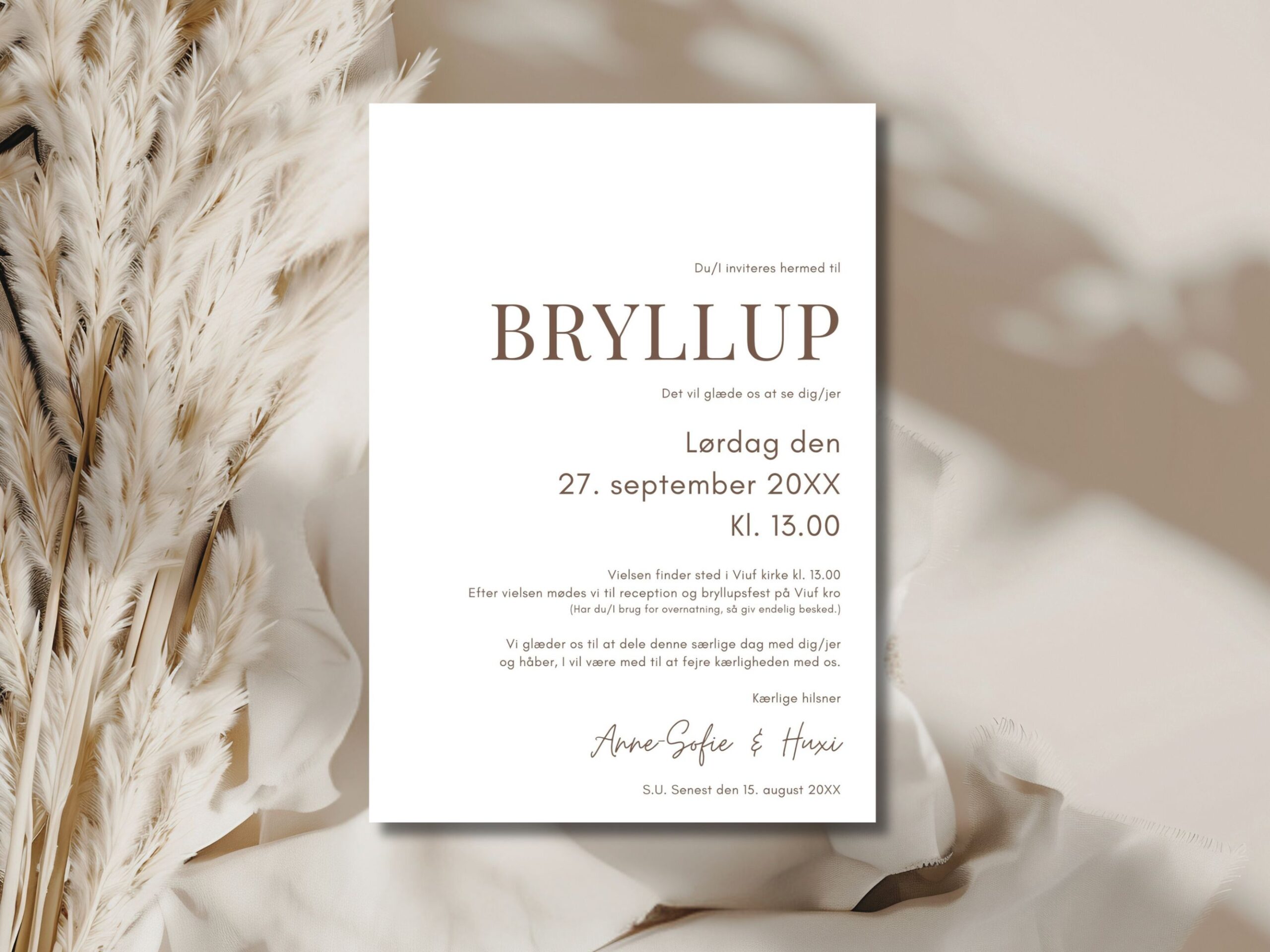 Skabelonerne giver jer fuld kreativ frihed til at tilpasse bryllupsinvitationerne, så de bliver helt unikke. I kan endda tilføje små personlige elementer, der betyder noget for jer som par. Dette gør det muligt at skabe en invitation, som ikke bare informerer gæsterne om begivenheden, men også formidler de følelser og den kærlighed, I ønsker at dele med dem.