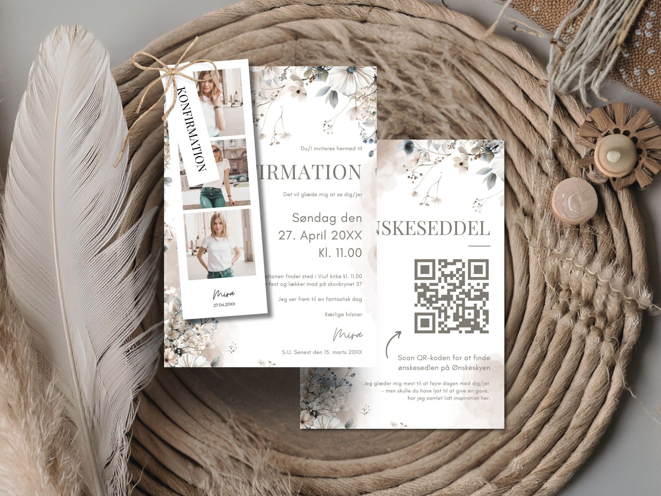 Med vores konfirmationsinvitationer kan du skabe en unik og personlig invitation til jeres store dag – direkte i programmet Canva (den gratis version). Vælg mellem smukke og elegante designs, som du nemt kan redigere i Canva med jeres egen tekst, farver og billeder, så invitationen afspejler både jeres stil og den kommende konfirmands personlighed.