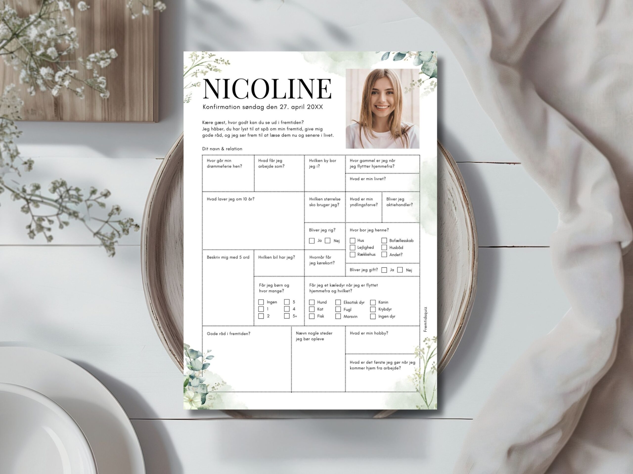 Skab smil og god stemning med en underholdende fremtidsquiz til konfirmationen! Lad gæsterne spå om konfirmandens fremtid og gætte på sjove spørgsmål som fremtidige drømmejob, rejsemål, antal børn eller hvilken hobby, der bliver en stor passion. Quizzen er den perfekte aktivitet til at samle gæsterne og skabe minder til den store dag.